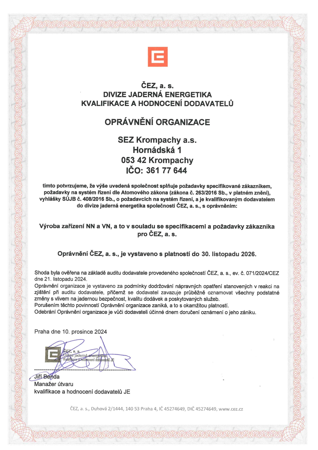 SEZ - Krompachy spĺňa požiadavky Divízie Jadrovej energetiky ČEZ a.s.